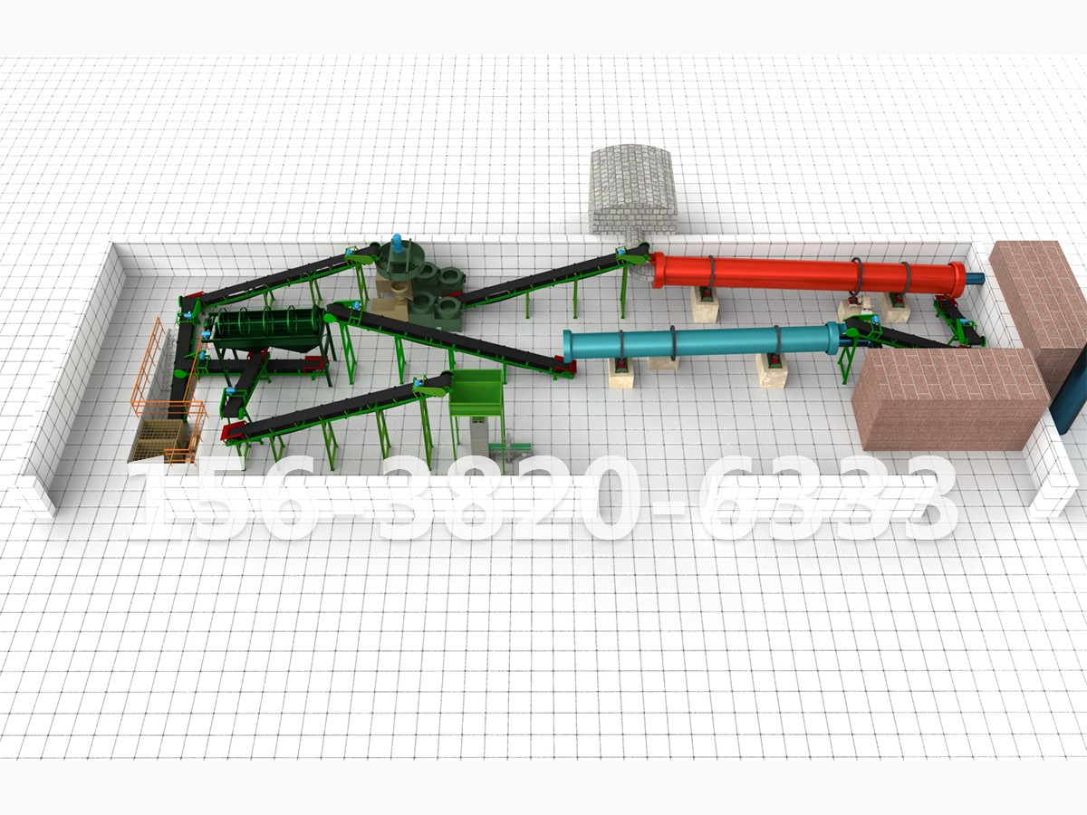 使用配料倉(cāng)將堆肥后的物料,和N、P、K等無(wú)機(jī)肥料,及其他添加物等原料,按對(duì)應(yīng)比例通過(guò)物料粉碎機(jī)和臥式混合機(jī),進(jìn)行粉碎、配比和混合。